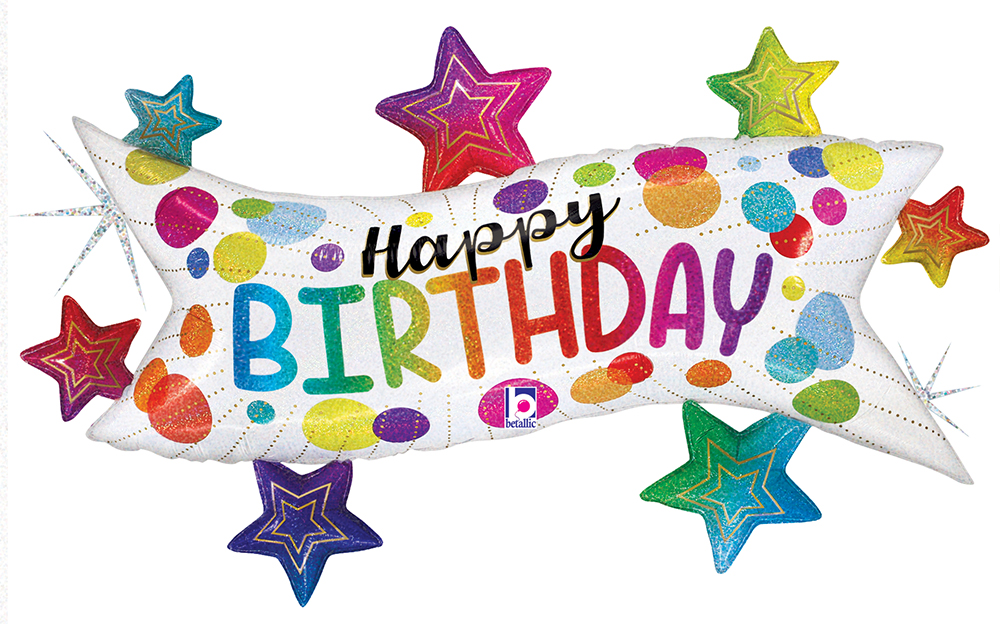 Our 37-inch Birthday Banner with Stars Balloon features bold, festive lettering surrounded by sparkling star designs, making it a vibrant centerpiece for any birthday celebration. Helium-ready and crafted from durable Mylar, this eye-catching balloon adds a fun and celebratory touch to your party décor.